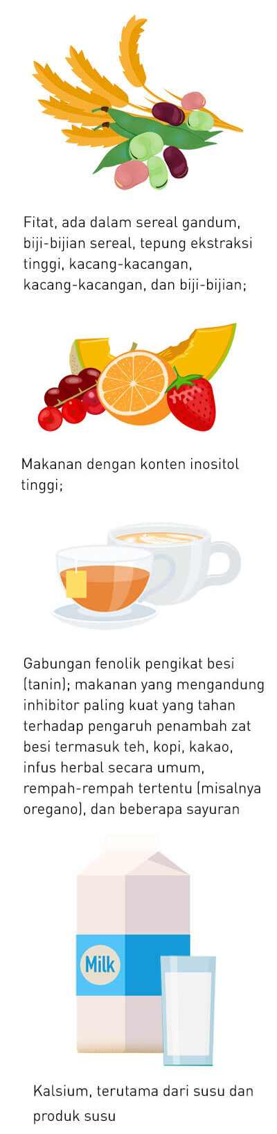 Gabungan fenolik pengikat besi (tanin); makanan yang mengandung inhibitor paling kuat yang tahan terhadap pengaruh penambah zat besi termasuk teh, kopi, kakao, infus herbal secara umum, rempah-rempah tertentu (misalnya oregano), dan beberapa sayuran