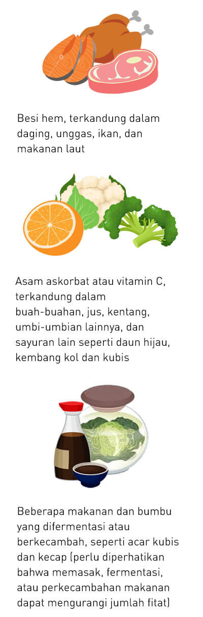 Salah satu cara terbaik adalah meningkatkan asupan makanan seseorang dengan mengonsumsi makanan yang membantu meningkatkan asupan zat besi (disebut "penambah zat besi") dan dengan menghindari makanan yang mengganggu penyerapan zat besi (juga dikenal sebagai "zat penghambat zat besi").